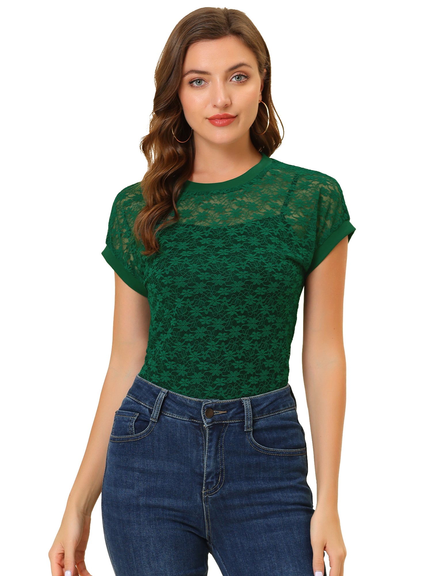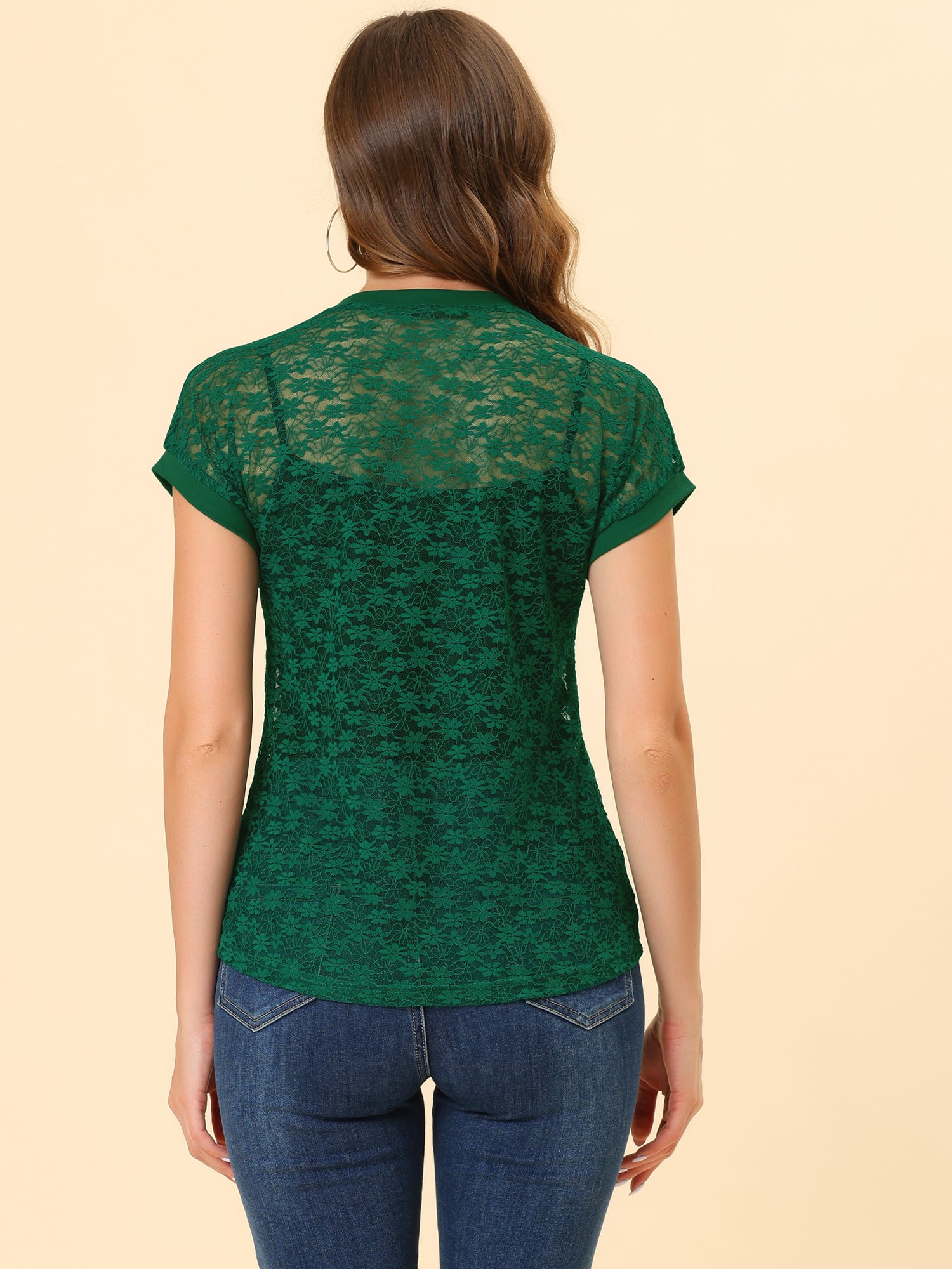 Top transparente de manga corta con cuello redondo y encaje floral para mujer