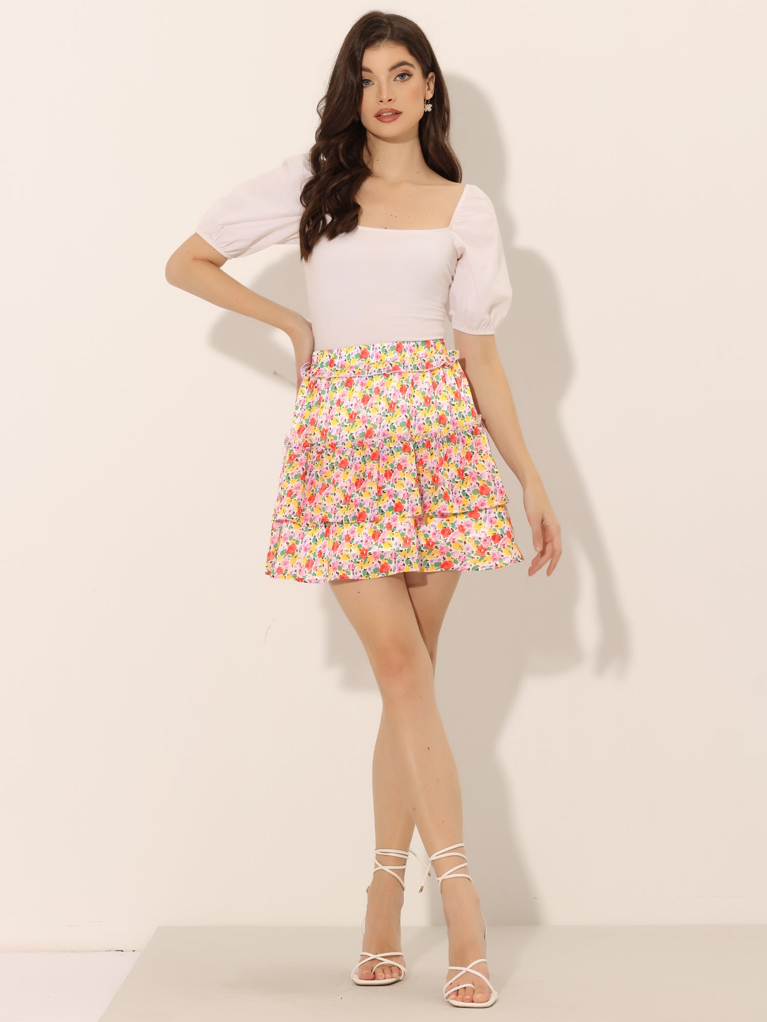 Minifalda skater floral con cintura elástica y dobladillo con volantes en capas para mujer