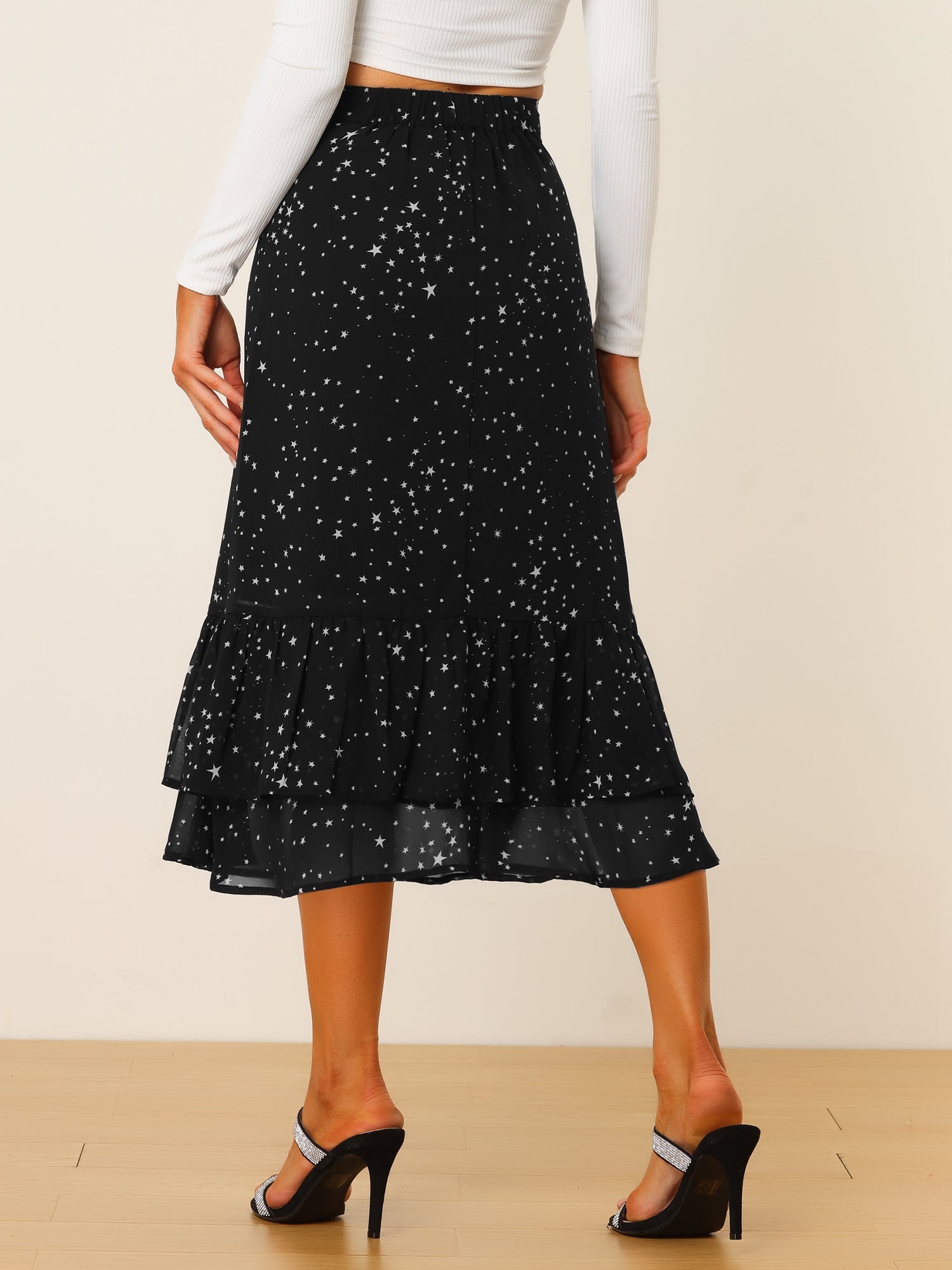 Falda midi holgada de gasa con volantes y estampado de verano para mujer