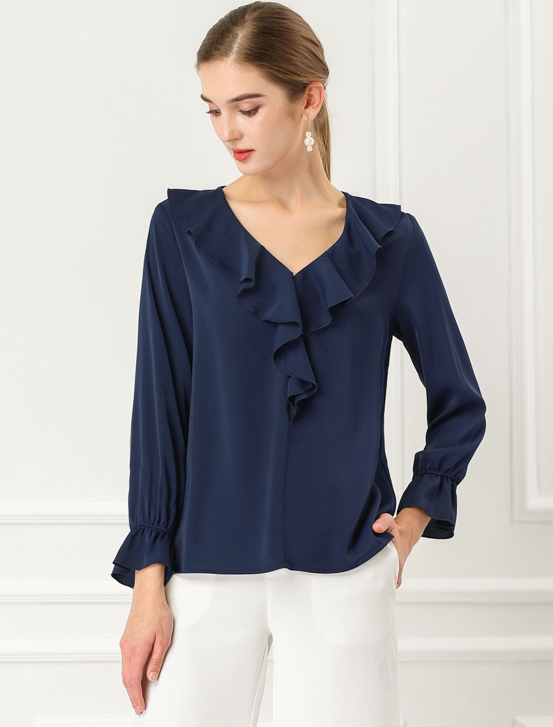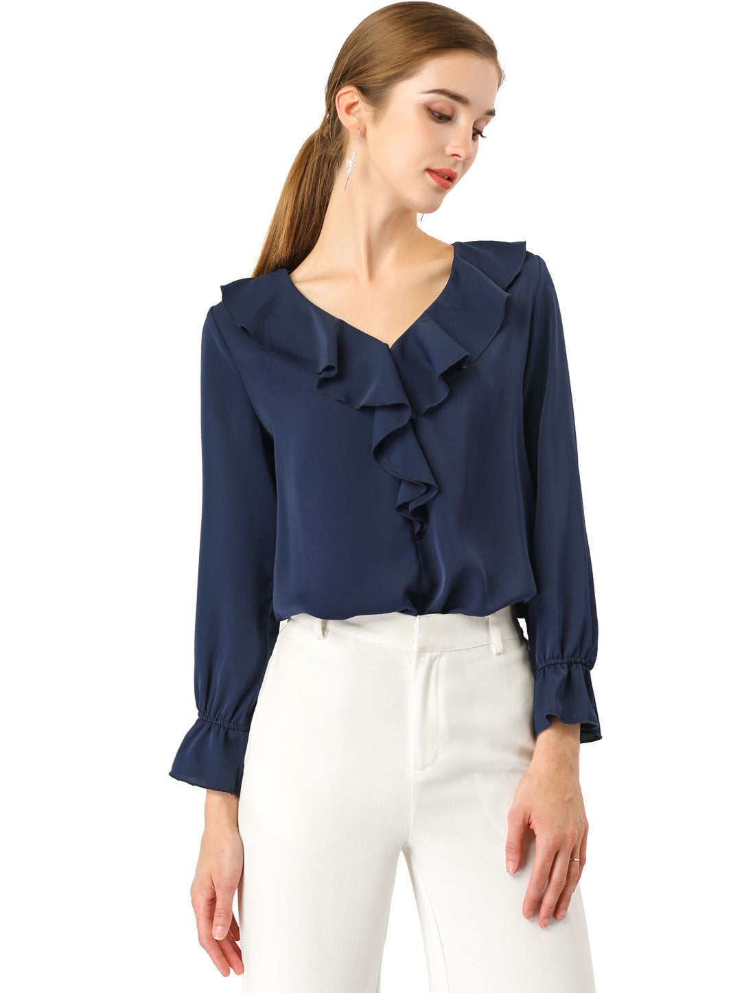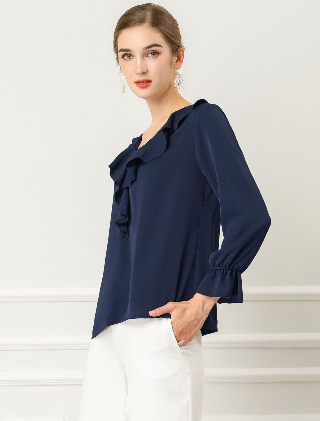 Blusa elegante con volantes para mujer, cuello en V, manga larga, informal, elegante