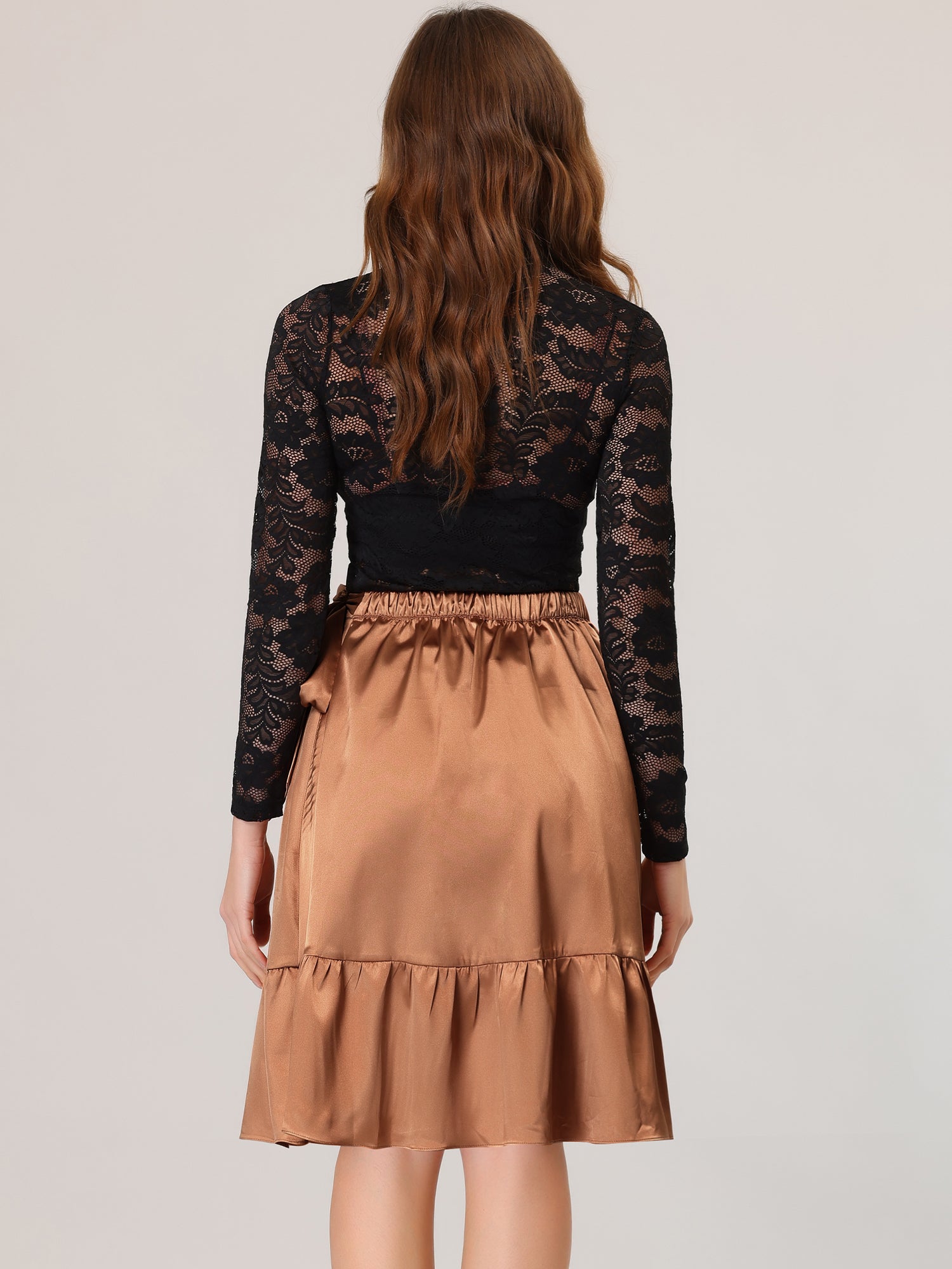 Falda midi asimétrica cruzada con lazo y cintura alta de satén con volantes para mujer
