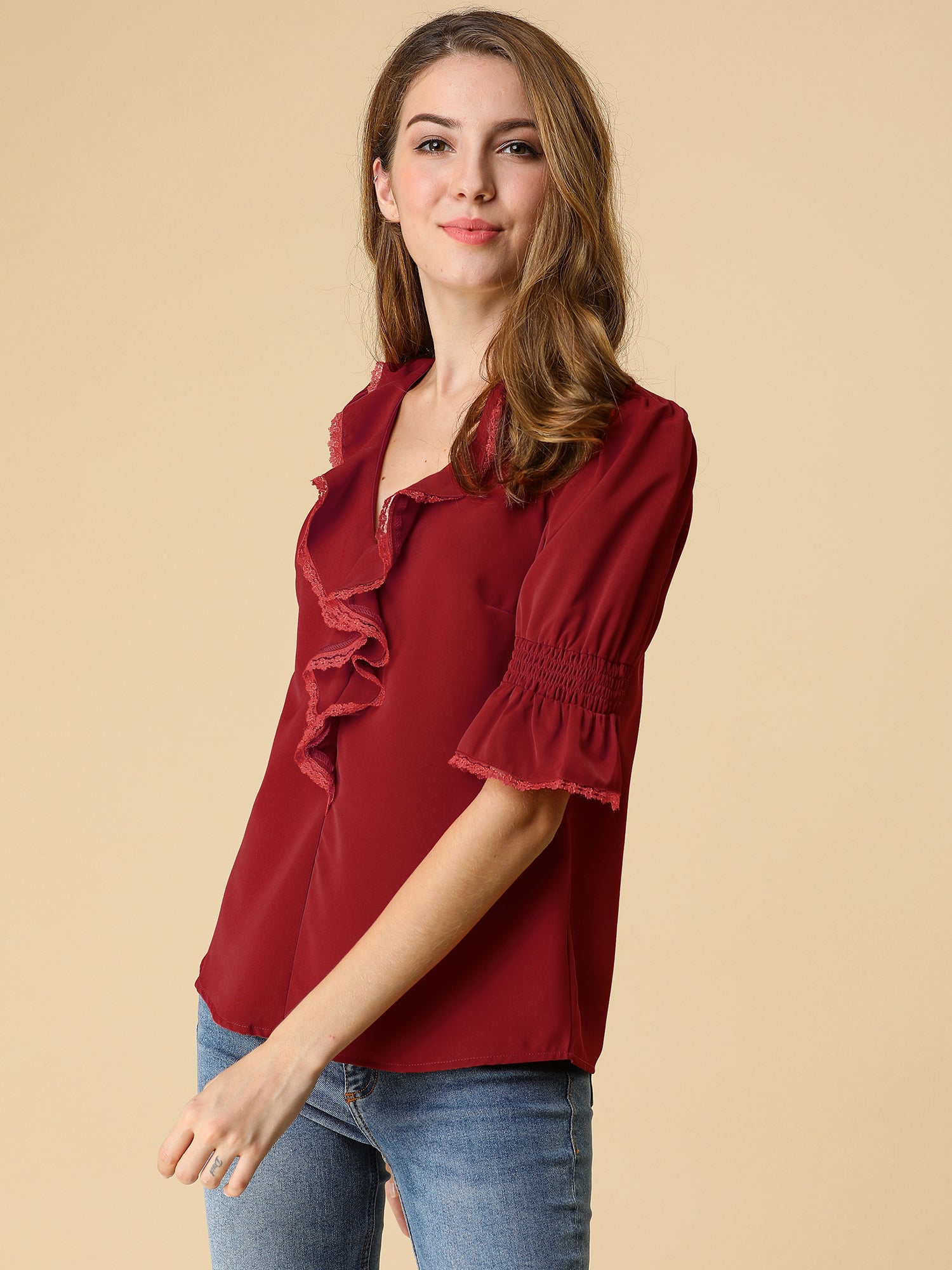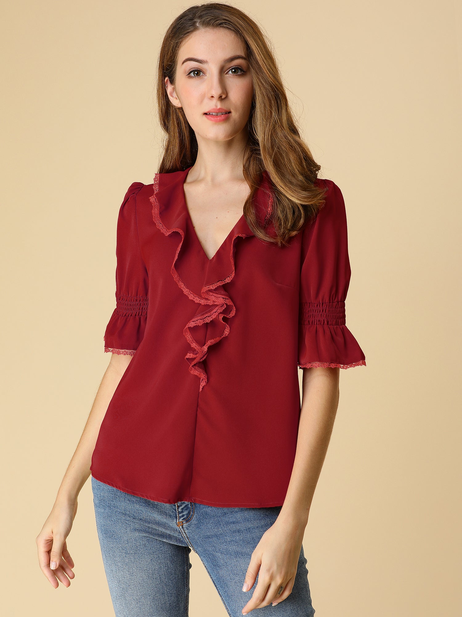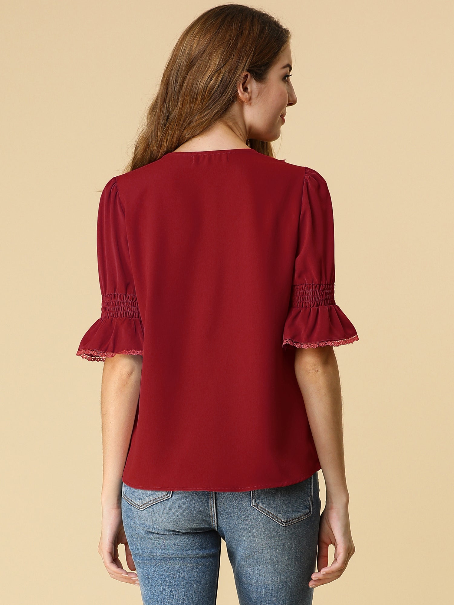 Blusa informal de gasa de verano con cuello en V y mangas abullonadas para mujer