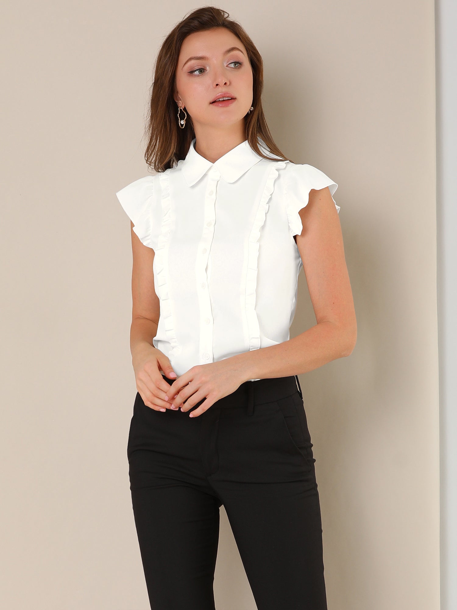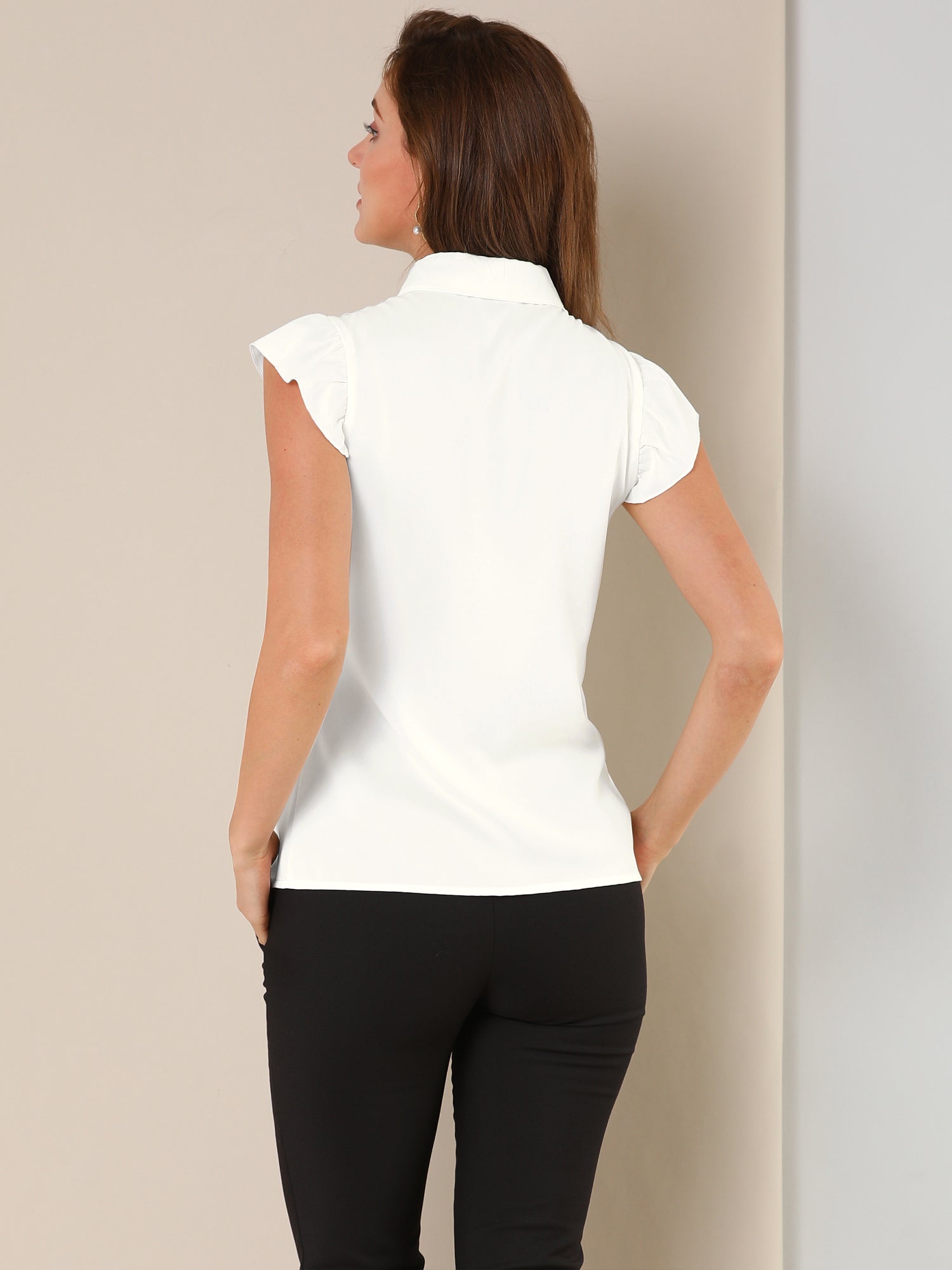 Women's Ruffles Cap Sleeve Tops Tie Neck Button Up Peter Pan Collar Blouse Shirts