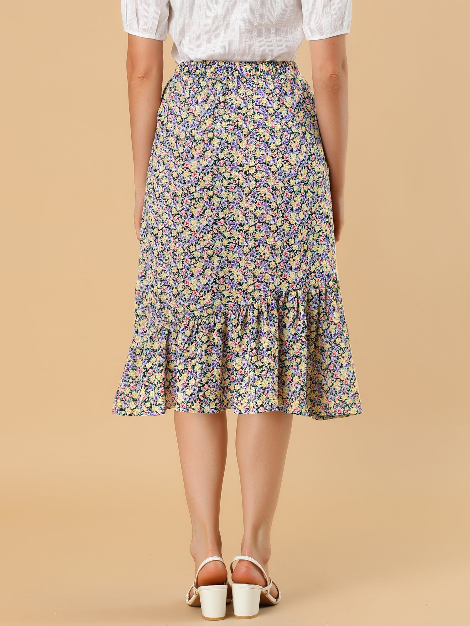 Falda floral de verano para mujer, cintura elástica, dobladillo alto y bajo con volantes, falda midi