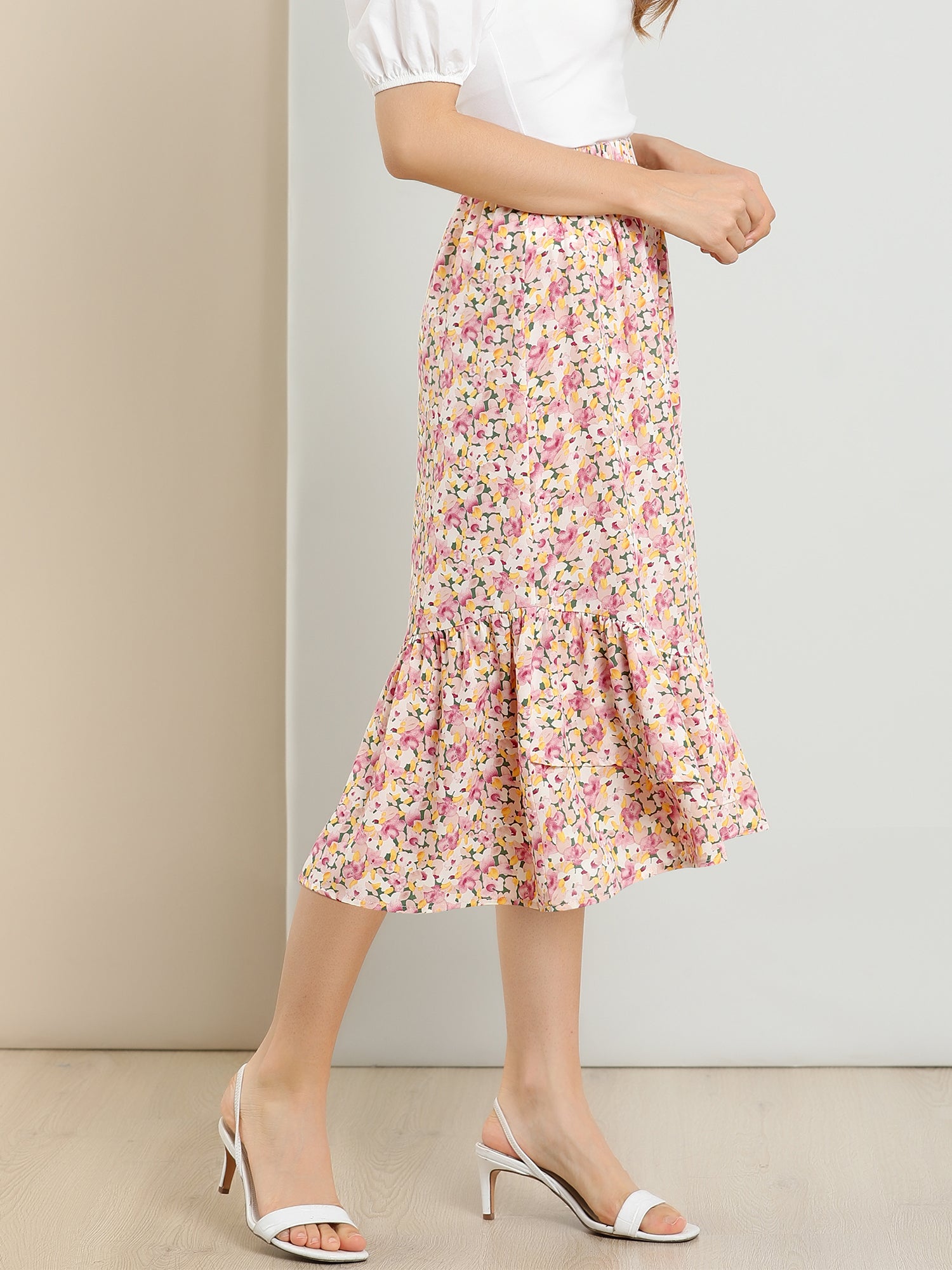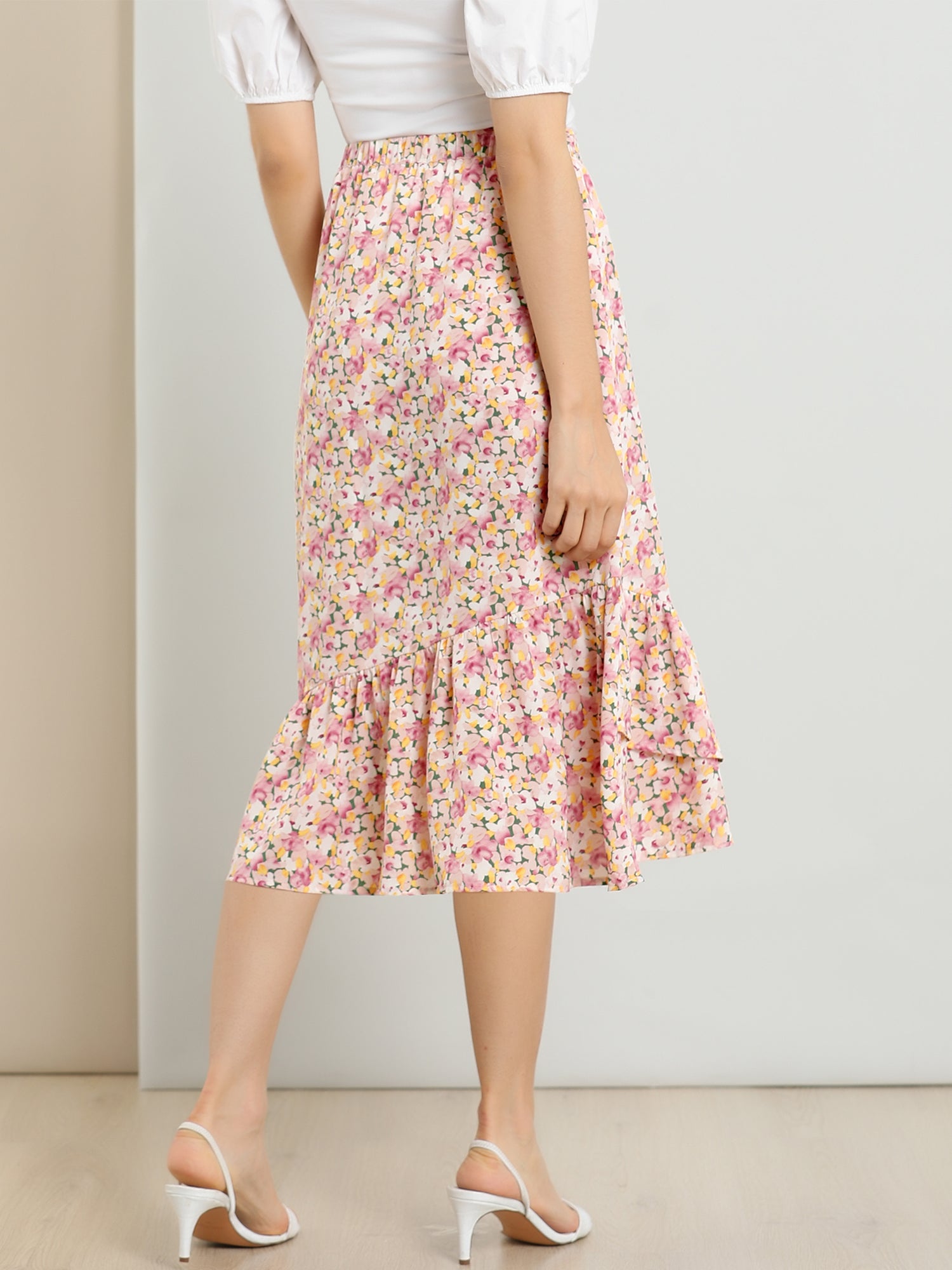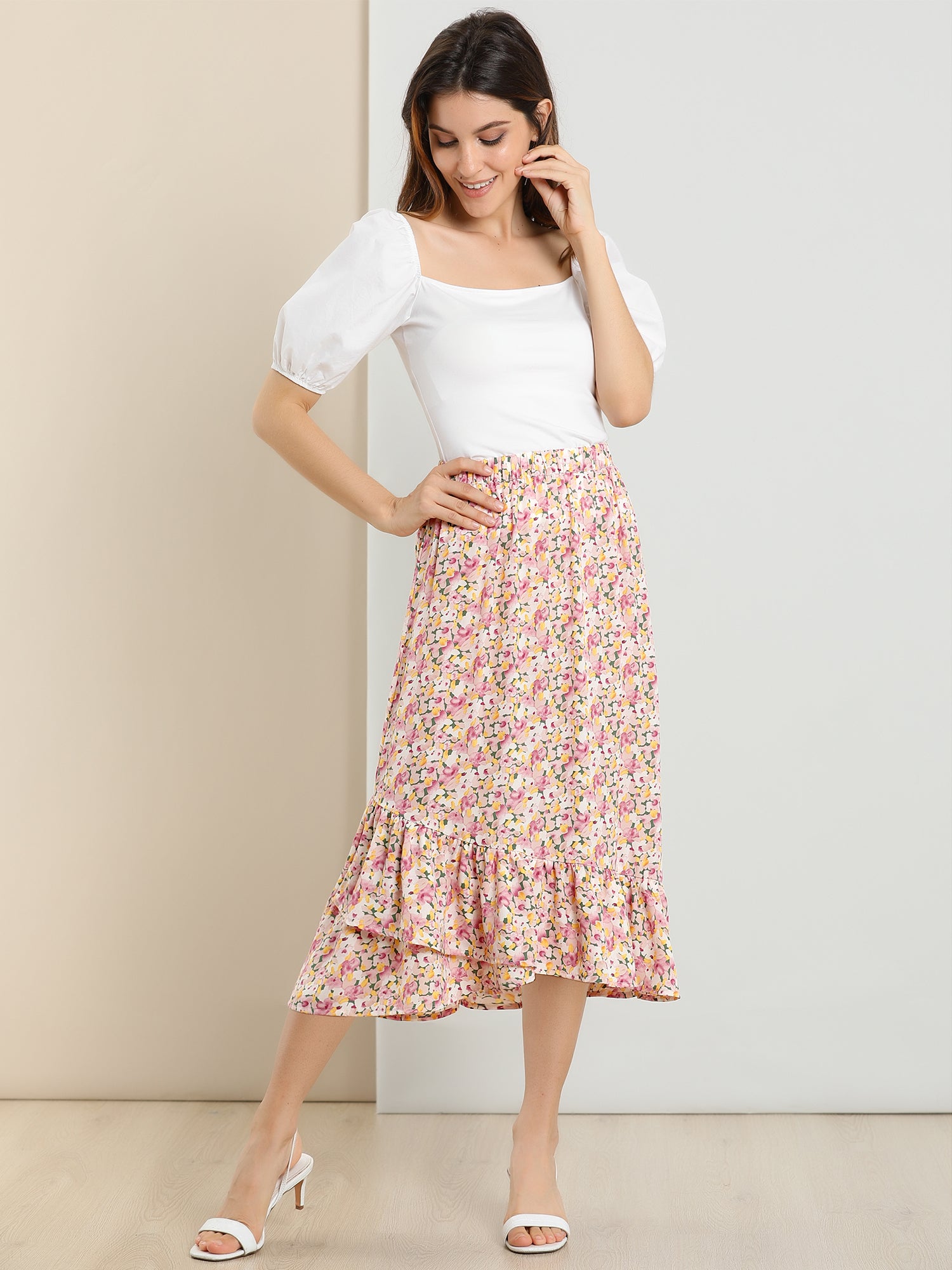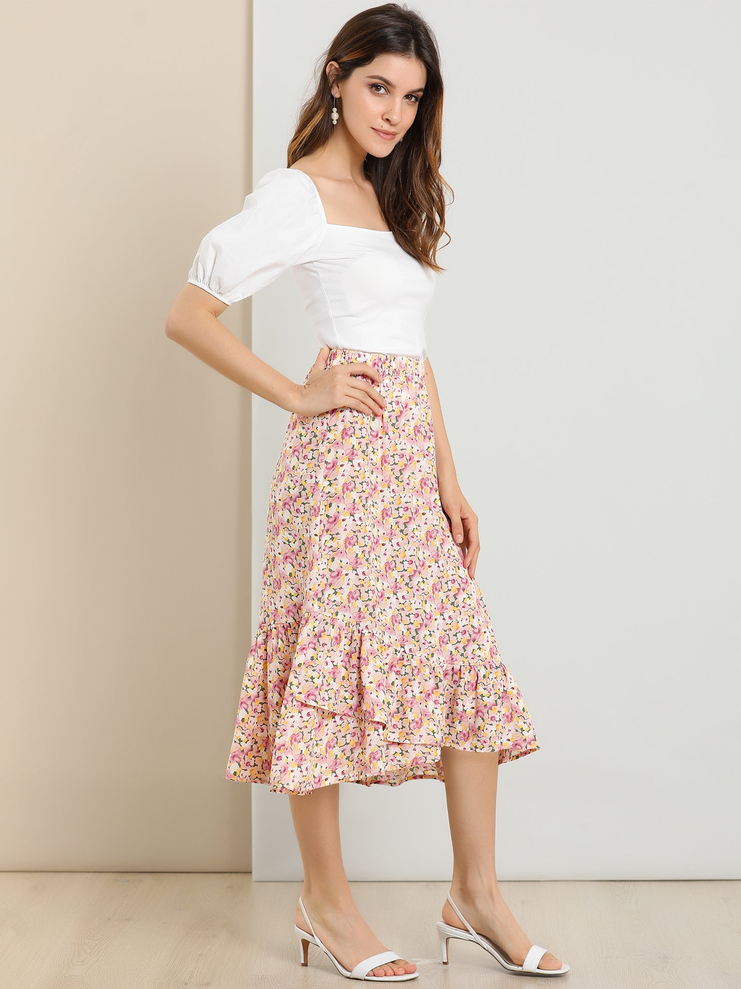 Falda floral de verano para mujer, cintura elástica, dobladillo alto y bajo con volantes, falda midi