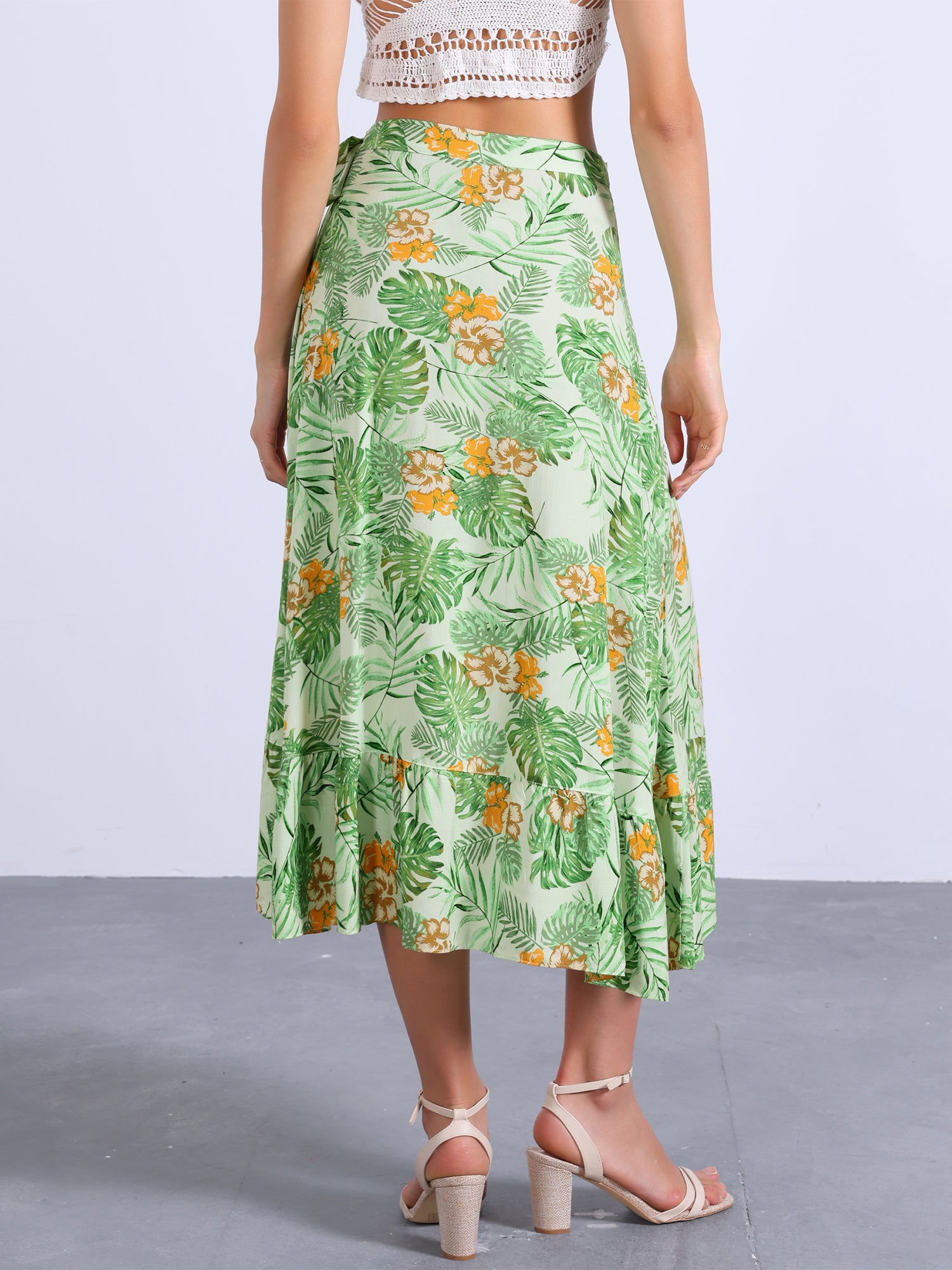 Falda cruzada playera con volantes y nudo para mujer, con estampado floral tropical