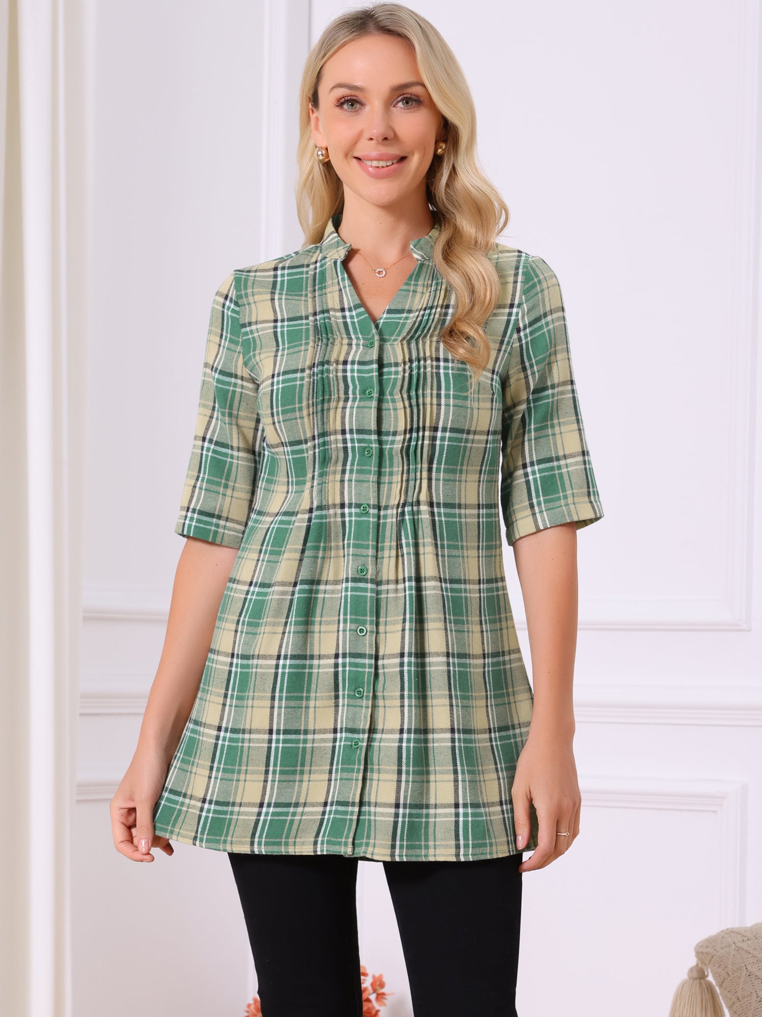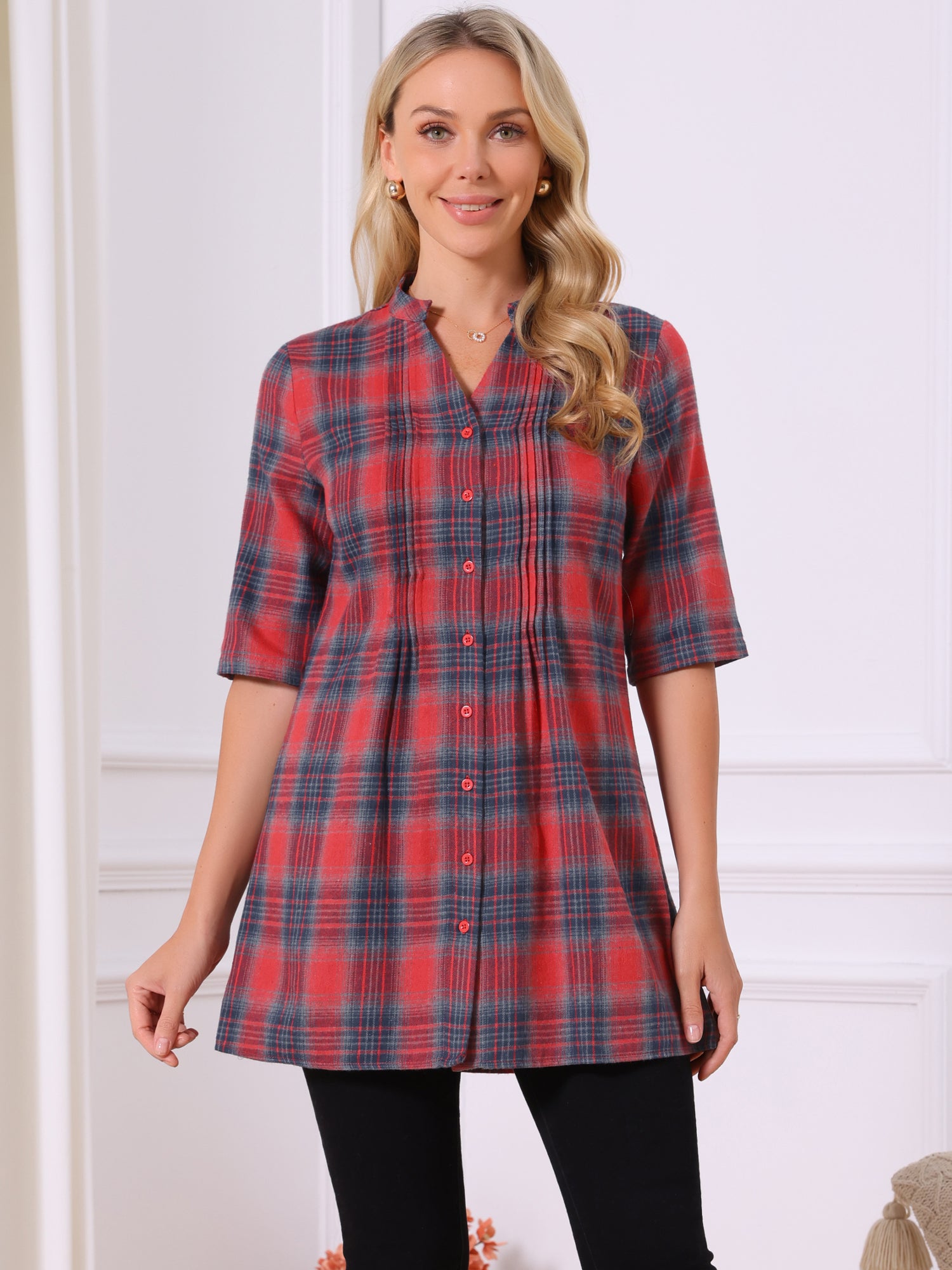 Women's Vintage Check Button Down Shirts V Neck 3/4 Sleeve Christmas Plaid Casual Tunic Blouse Top