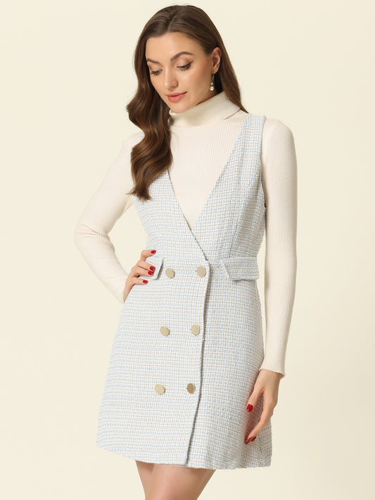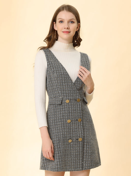 Women's Elegant Retro Button Front V Neck Plaid Tweed Overalls Pinafore Dress