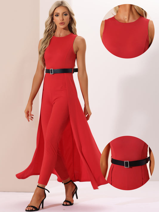 Women's Patchwork Overlay Jumpsuit Elegant Sleeveless Belted High-Waist Rompers