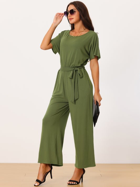 Women's Crewneck Short Sleeve Belted High Waist Wide Leg Casual Dressy Jumpsuits with Pockets