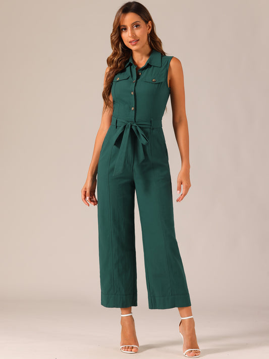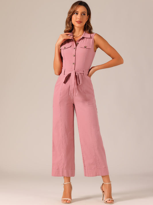 Women's Wide Leg Jumpsuit Sleeveless Collared Tie Waist Coverall Button Down Cargo Jumpsuits