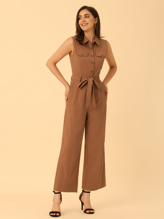 Women's Wide Leg Jumpsuit Sleeveless Collared Tie Waist Coverall Button Down Cargo Jumpsuits