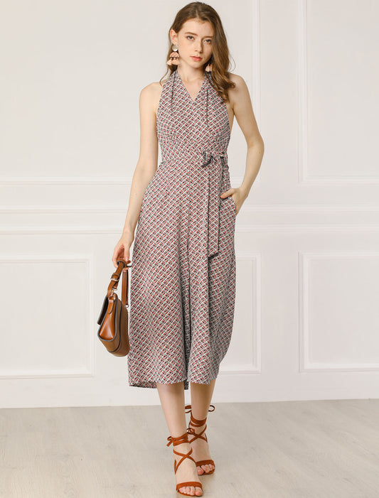 Women's Cropped Wide Leg Jumpsuit Halter Sleeveless Backless Plaid Tile Crop Jumpsuits