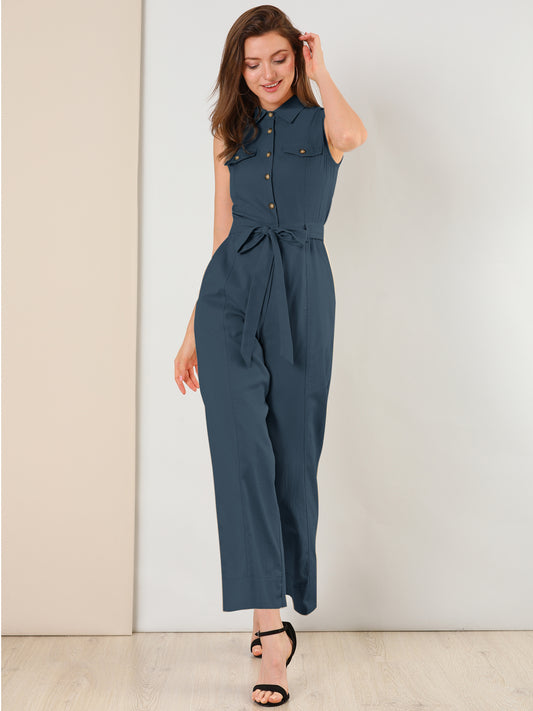 Women's Wide Leg Jumpsuit Sleeveless Collared Tie Waist Coverall Button Down Cargo Jumpsuits
