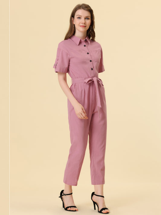 Women's Short Sleeve Collared Cropped Coverall Button Down Tie Waist Cotton Cargo Jumpsuit