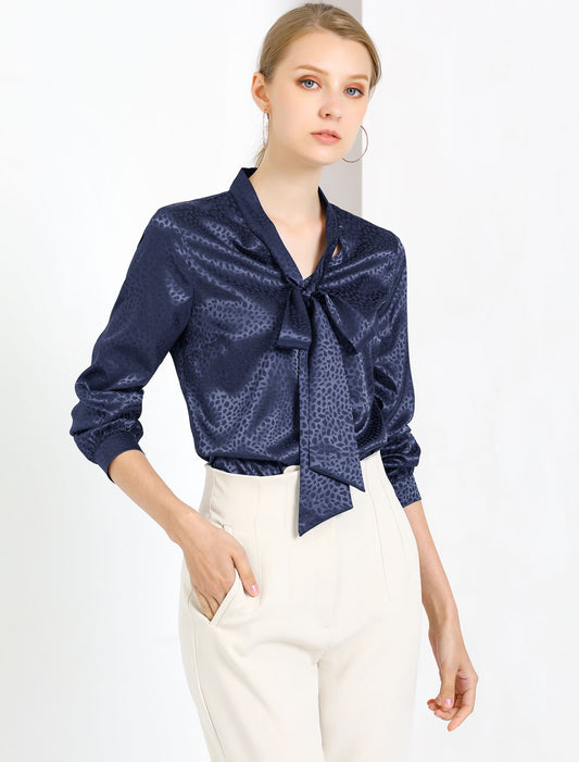 Women's Bow Tie Neck Long Sleeve Printed Satin Embossed Blouse