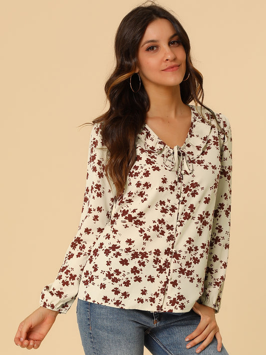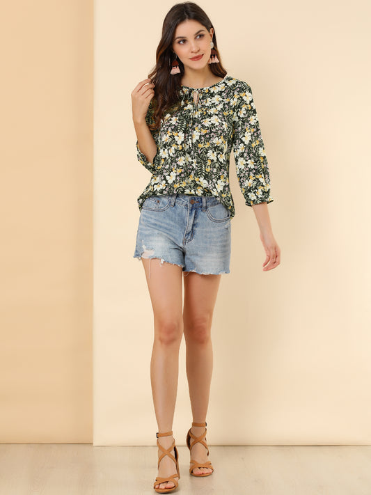 Women's Tie Neck 3/4 Sleeve Floral Blouse Bow Top