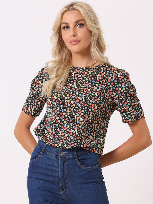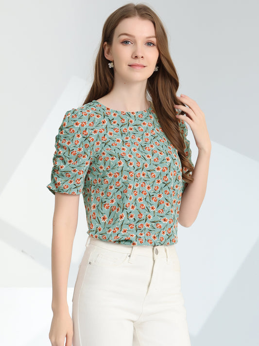 Women's Floral Crew Neck Summer Shirred Short Sleeve Blouse
