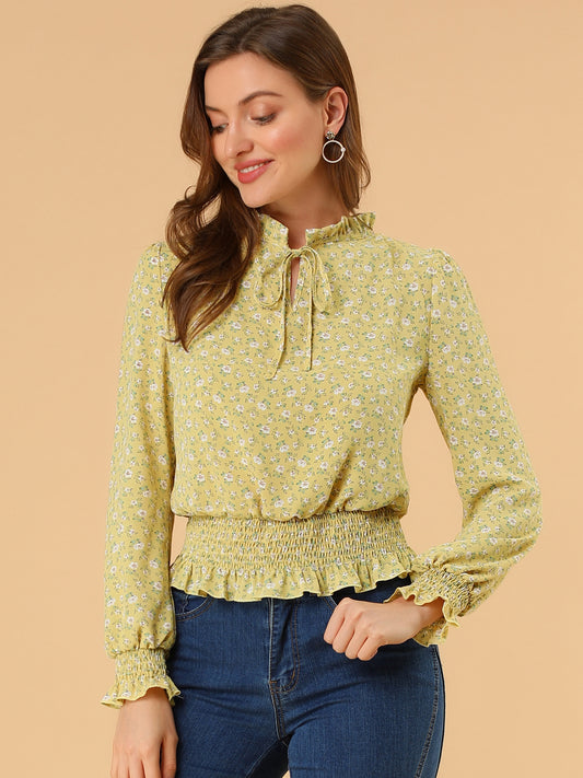 Women's Ruffle Neck Long Sleeve Cropped Smocked Floral Blouse