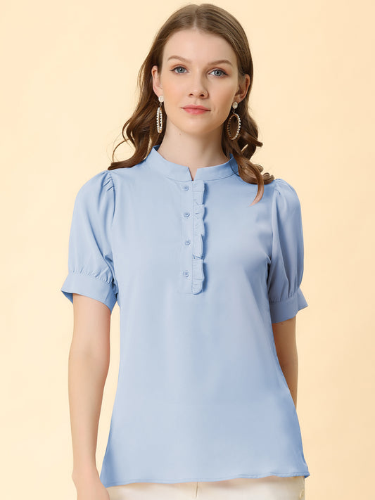 Women's Retrp Workwear Half Placket Puff Sleeve Ruffled Blouse Top