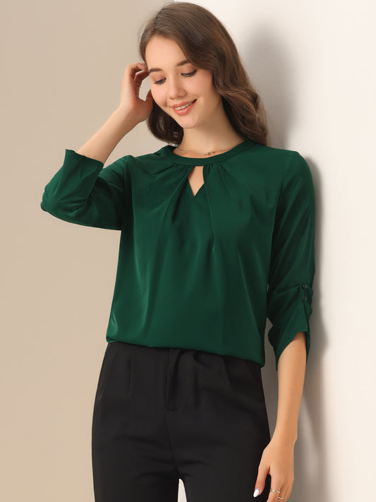 Women's Dressy Work Office Keyhole Pleated Front Ruched 3/4 Sleeve Chiffon Shirt