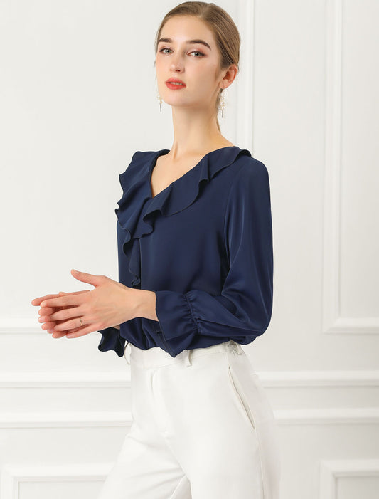 Women's Ruffle Blouse Elegant V Neck Long Sleeve Casual Dressy Top