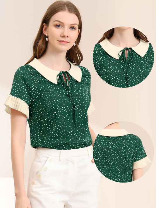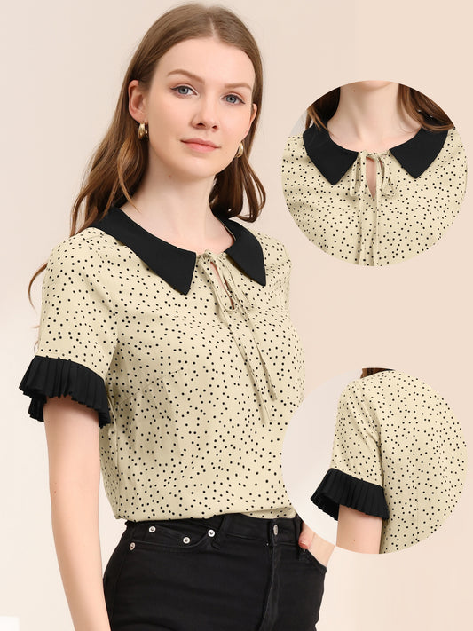 Women's Contrast Doll Collar Polka Dots Short Sleeves Blouse Shirt Top