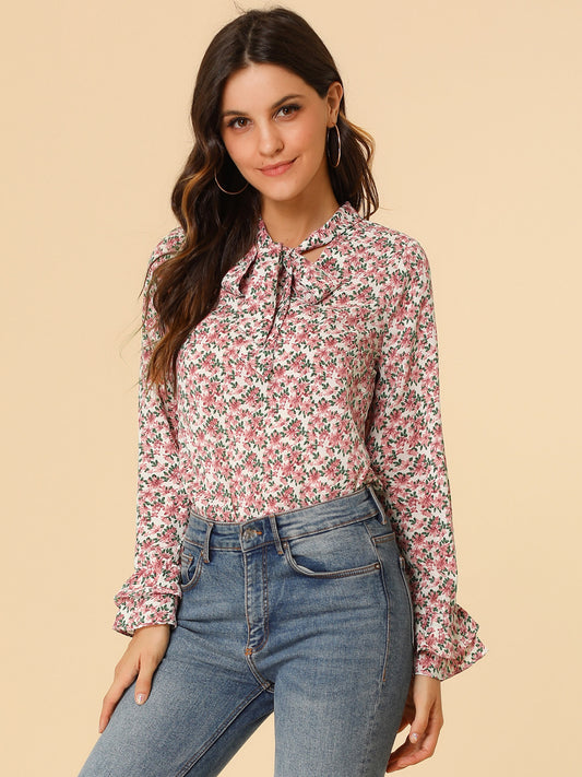 Women's Long Sleeve Blouse Floral Tie Neck Chiffon Ruffle Top