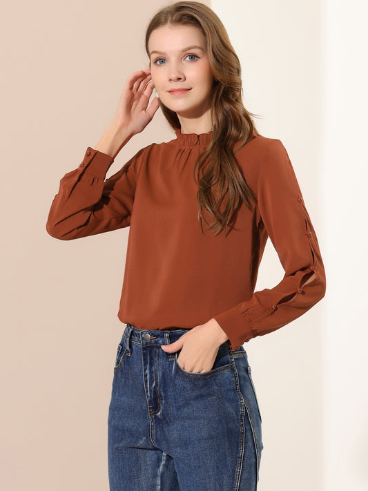 Women's Chiffon Blouse Ruched Stand Collar Pearl Beaded Long Sleeve Top