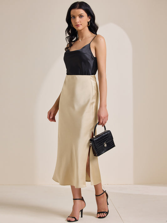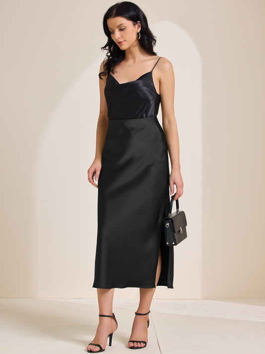 Women's Satin Elastic High Waist Side Slit Elegant Flowy Maxi Skirt