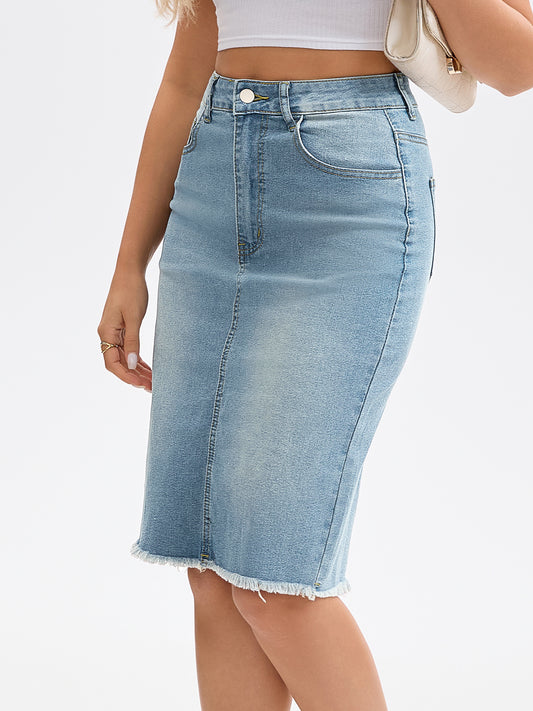 Women's Denim Skirt Raw Hem High Waisted Pockets Stretch Knee Length Jean Skirt