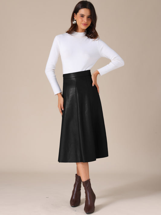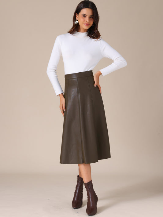 Women's High Waist A Line Faux PU Leather Midi Skirt