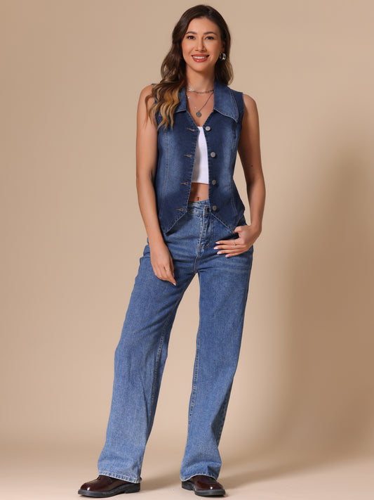 Women's Denim Waistcoat Button Closure Notched Lapel Vest