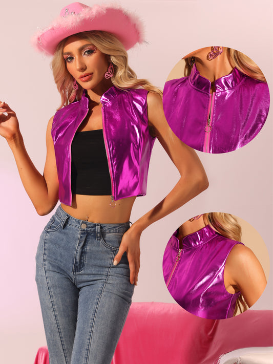 Women's Faux Leather Zip Up Sleeveless Cropped Metallic Shiny Vest