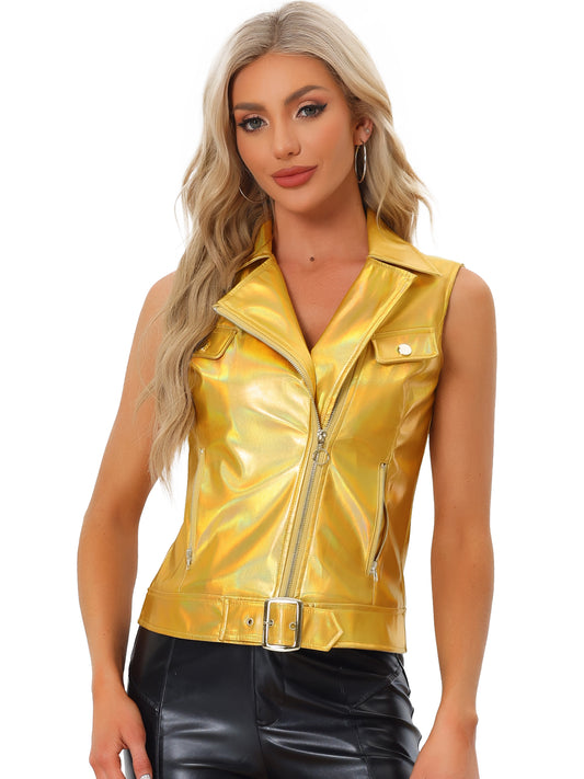 Women Zip Up Moto Biker Sleeveless Metallic Holographic Shiny Vest