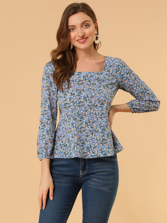 Women's Floral Blouse Square Neck Belted Waist Peplum Top