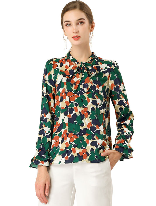 Women's Long Sleeve Blouse Floral Tie Neck Chiffon Ruffle Top