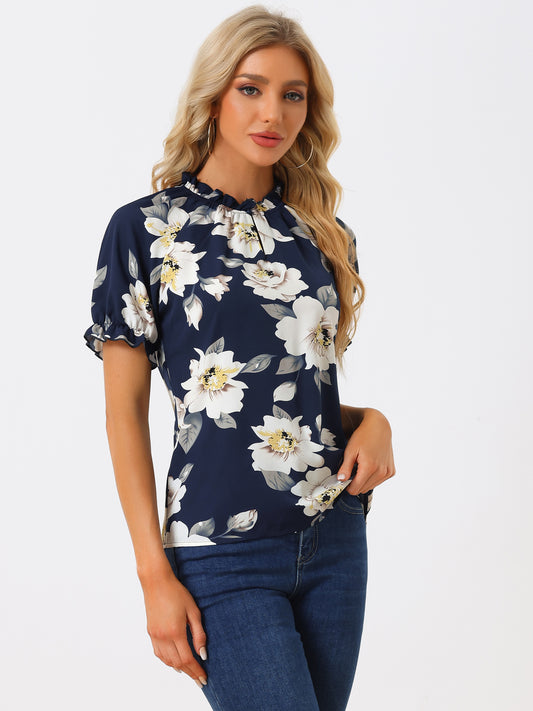 Women's Ruffle Floral Top Mock Neck Short Sleeve Summer Casual Blouse