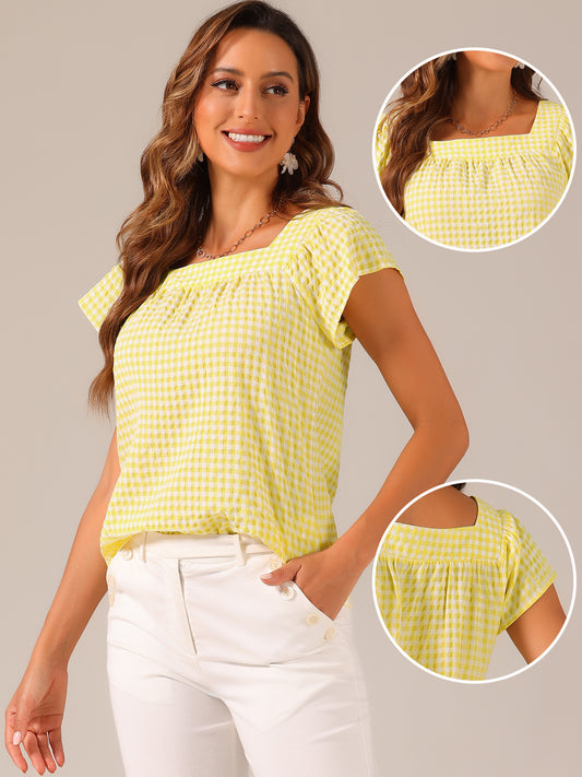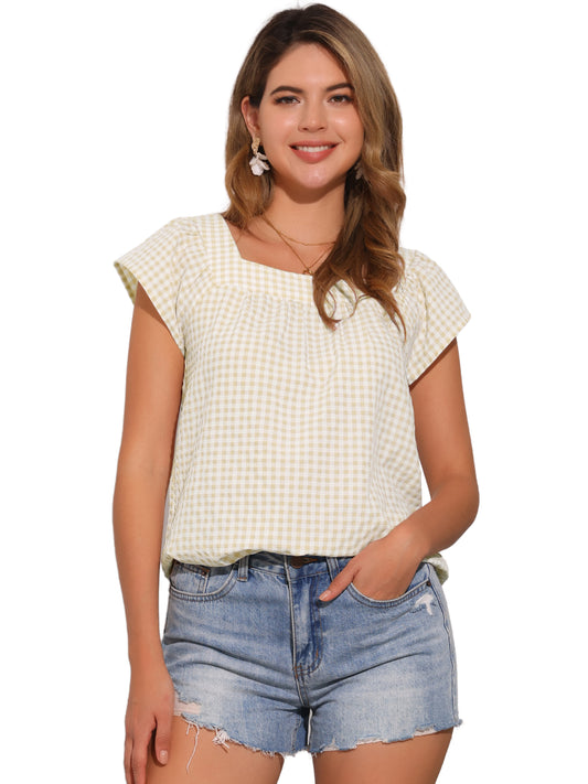 Women's Cap Sleeve Summer Square Neck Gingham Blouse Top