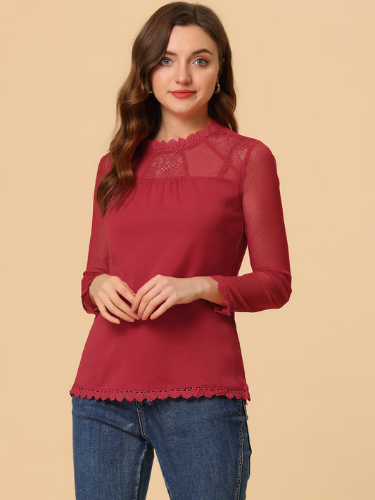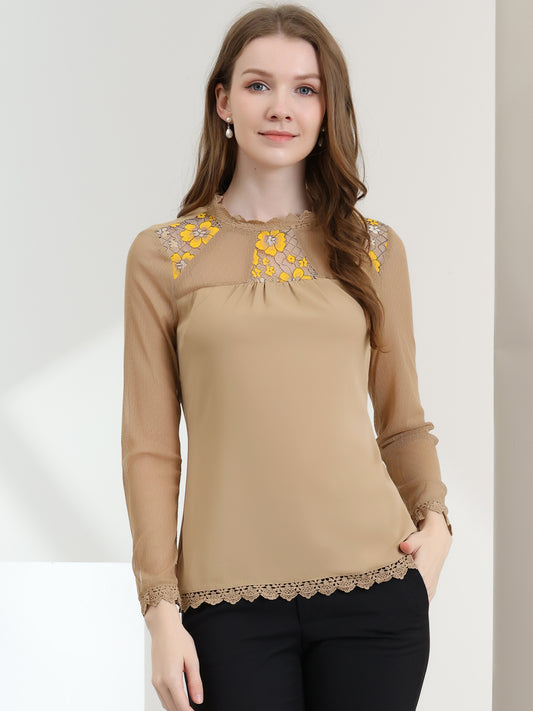 Women's Chiffon Top Elegant Sheer Mesh Lace Long Sleeve Blouse