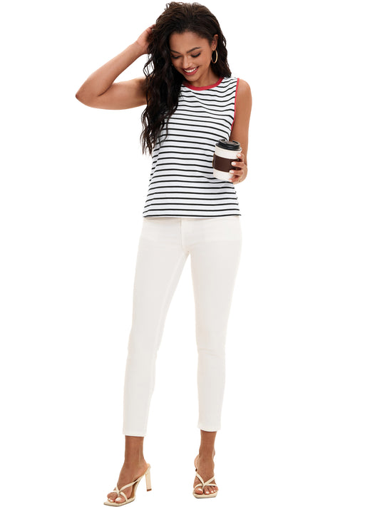 Womens Summer Sleeveless Tank Tops Ribbed Racerback Contrast Trim Crew Neck Slim Fitted Casual Basic Top