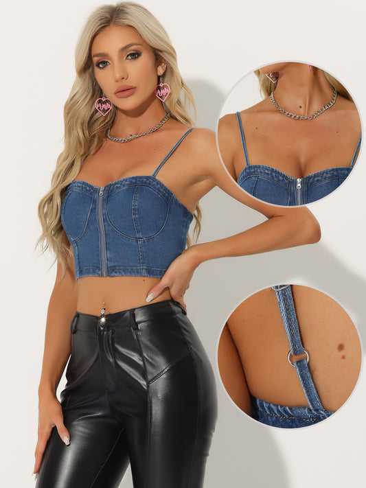 Women's Denim Bustier Crop Top Zip Up Adjustable Straps Jean Corset Top