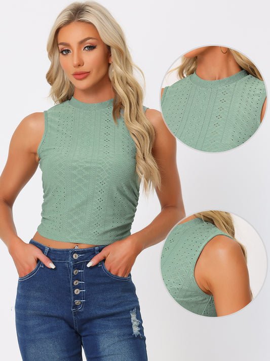 Women's Summer Tank Top Casual Sleeveless Mock Neck Eyelet Slim Fitted Ruched Crop Top