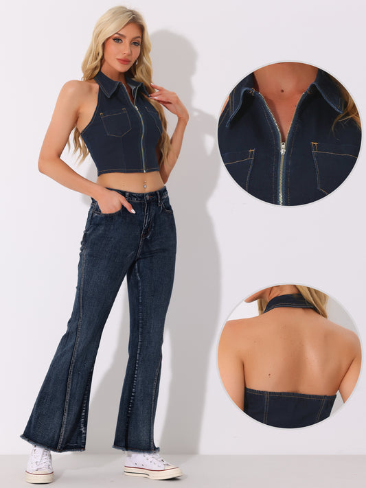 Women's Zipper Up Collared Sleeveless Jean Corset Denim Halter Top