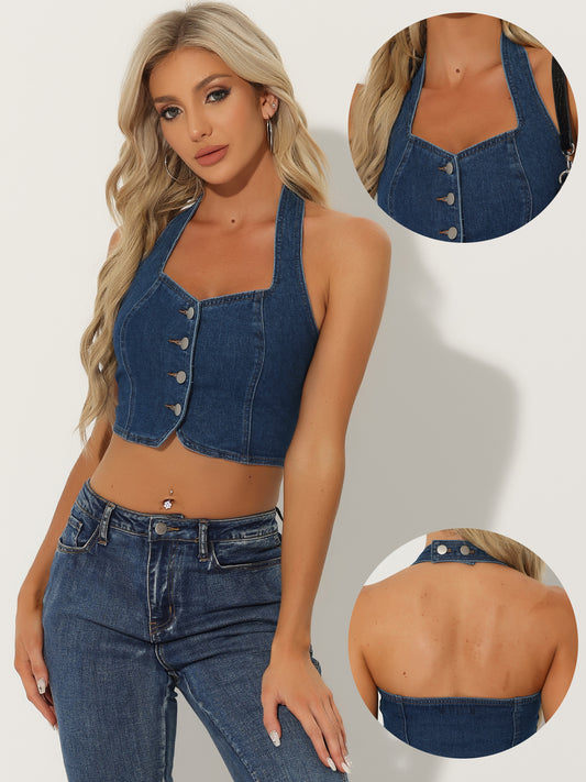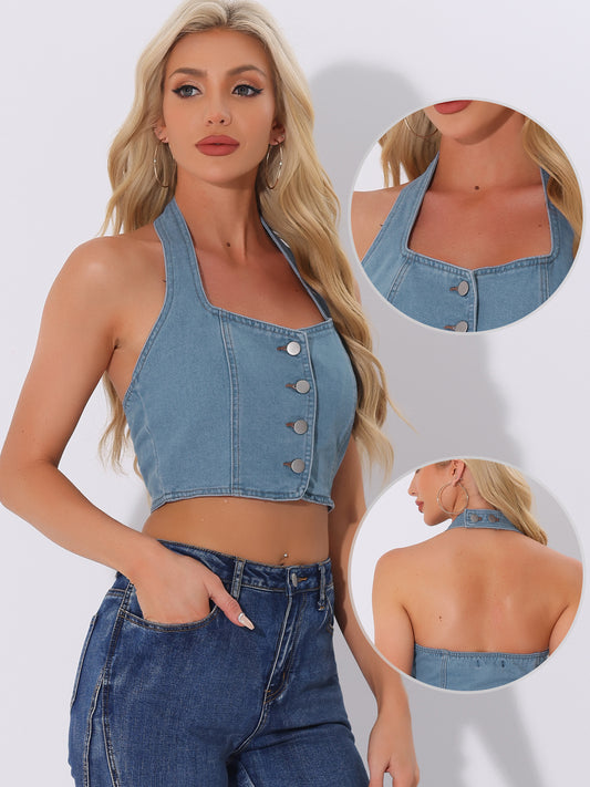 Women's Denim Crop Top Sleeveless Button Front Halter Backless Jean Tank Top