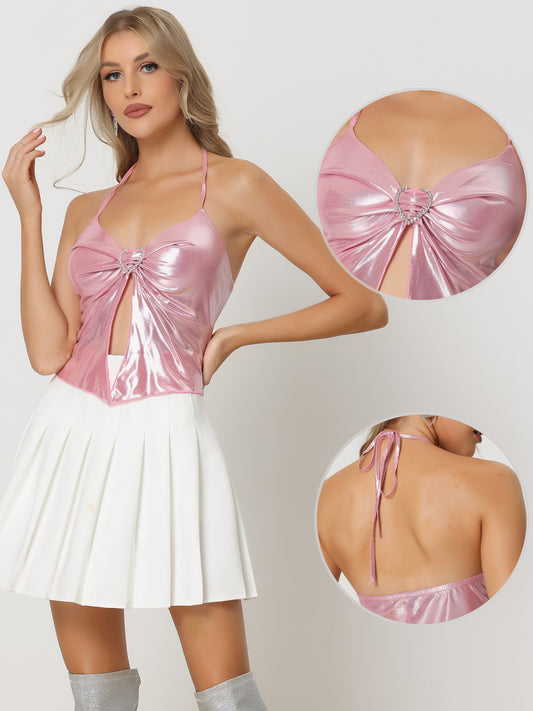 Women's Metallic Backless Cami Asymmetrical Spaghetti Straps Halter Sparkle Top