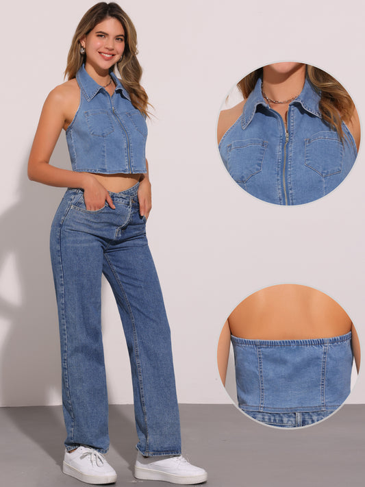 Women's Zipper Up Collared Sleeveless Jean Corset Denim Halter Top