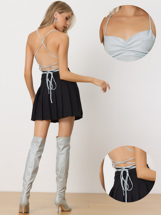 Women's Sparkle Crop Tops Glitter Party Crisscross Back Spaghetti Strap Cami Top Slim Fit Tank Top