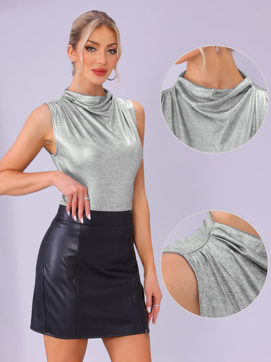 Women's Cowl Neck Ruched Sleeveless Party Shiny Metallic Tank Top
