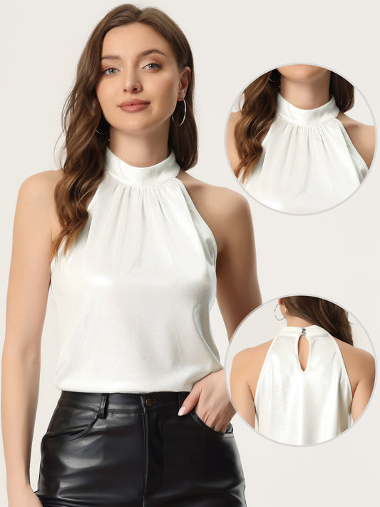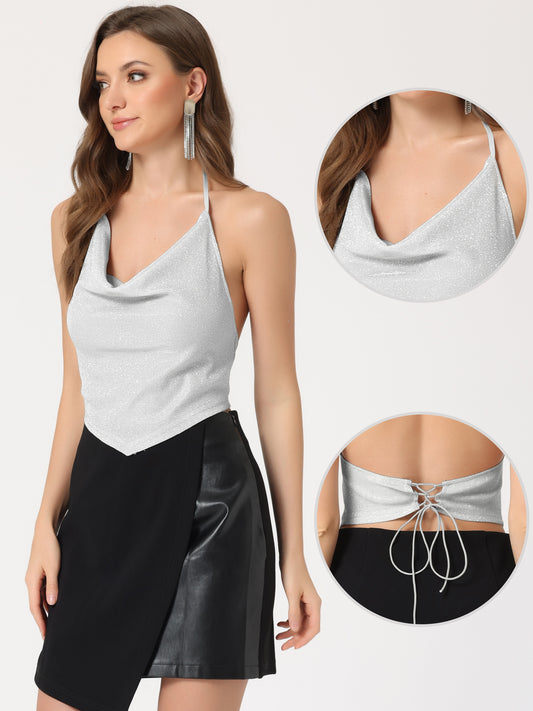 Women's Sparkly Metallic Camisole Party Cowl Neck Backless Glitter Halter Top